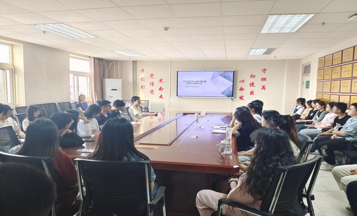 为进一步加强在校大学生心理健康教育,在学生中营造一种学习、普及、宣传心理健康知识,关心、理解、帮助有心理健康困扰的同学,共同创建促进大学生心理健康成长的良好氛围,我院特邀唐山市中心医院临床心理科王磊医生举办“大学生常见的心理问题处理及危机干预的方法”心理健康教育讲座。学院的心理委员和宿舍长参加此次讲座。
