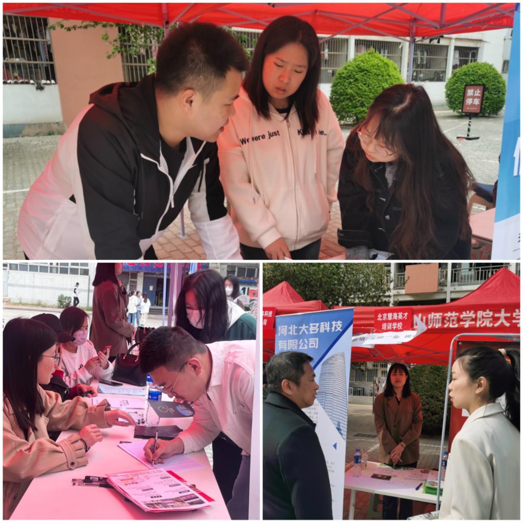 参加此次招聘会的用人单位有17家,其中包括河北省内部分公立、民营学校及民营企业。招聘会现场秩序井然,应届毕业生穿梭于各单位招聘展位前,主动与用人单位沟通交流,详细询问企业情况、岗位职责、福利待遇等相关信息,还结合自身优势和兴趣点积极选择心仪的单位进行深入了解。招聘会还吸引了许多低年级的同学前来,提前了解相关单位的实习就业信息,为接下来的职业规划和发展做准备。
