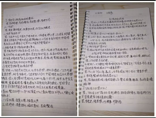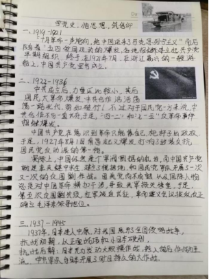 广大物理学院青年学子踊跃报名,积极参加,翻阅各种资料了解党史,在此过程中提高了自己的思想境界。本次活动分为两个阶段,第一步为同学们自主查找并学习有关党史的内容。第二步为同学们在学习后完成学习笔记并按时分享。本次活动以线上形式开展,同学们认真学习有关党史的内容,了解党的光辉历程,并按时分享学习笔记。从同学们提交的作品中,我们看到了同学们对党史了解的程度,同时爱国主义思想也更加坚固地植入了同学们的心中。涌现了一批以王睿童、李忆璇、刘静蕾等同学为代表的优秀作品。这些同学的学习笔记字迹工整,笔记内容丰富,对不同主题进行了划分。条理分明,逻辑清晰。其中王睿童的学习笔记内容深刻,可以看出该同学在学习党史之后进行了深入的反思总结,我们看到了她思想的深度和对信仰的认识。高森同学的学习笔记不仅有对学习内容的总结分析,同时还搜集了与党的光辉历史有关的图画。笔记工整,分析内容深刻,值得我们为他点赞。刘静蕾同学的学习笔记对重点内容用不同颜色标出,美观大方。王若彤同学的笔记,总结了“四个意识”和“两个维护”的概念,可以看出她认真学习了党史,同时分点清晰,字迹清楚。
