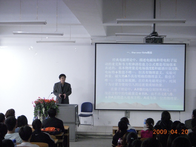 2009年度永利集团“百家讲坛”第六讲于   2009年     4月     20下午4点在我校图书馆报告厅开讲,我系邀请到河北科技大学研究生院副院长,硕士生导师白志明教授做了一场以“纳米材料中的Aharonov-Bohm效应”为主题的报告,首先由物理系副主任崔乃忠老师对白教授作了简单介绍,在同学们热烈的掌声下白教授开始了他的报告。白教授介绍了Aharonov-Bohm效应、不均匀磁场对耦合量子点AB干涉仪的影响、声子对持续电流的影响和耦合量子环中的持续电流,最后得出尽管磁场对电子无洛伦兹力作用,但磁矢势会影响电子波函数的位相,影响电子的相干性的结论。因此磁矢势在微观领域更具有本质性。在耦合量子点系统中,磁场以及磁通量的不均匀性均会改变电子波函数的位相,对电子的相干性产生影响。声子的散射影响电子的运动,抑制持续电流。耦合量子环中,穿过一个环的磁通量将影响另一个环中的持续电流。Kondo效应对不同格点数的金属环中的持续电流有抑制与帮助作用。虽然报告过程中投影仪出现故障但白教授依然继续他激情的报告,台下同学还协助老师把小黑板抬上讲台以便白教授更加形象的讲述报告。报告最后,同学们还提出许多疑问白教授一一作了耐心的解答。此次报告,使我系广大同学对纳米材料中的Aharonov-Bohm效应有了更深一步的认识,也激发了同学们对物理研究领域的兴趣。