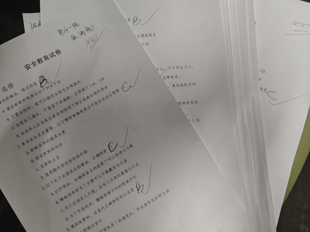 活动现场,负责人围绕消防安全、防溺水安全、防诈骗安全、宿舍电器安全等内容展开讲解,广泛宣传各类安全知识,力求让安全理念深入人心。为检验此次教育活动的成效,全体参与人员进行了安全知识测试。试卷内容紧密围绕班会讲解要点与演练实操知识,全面考查学生理论掌握与实践应用能力。