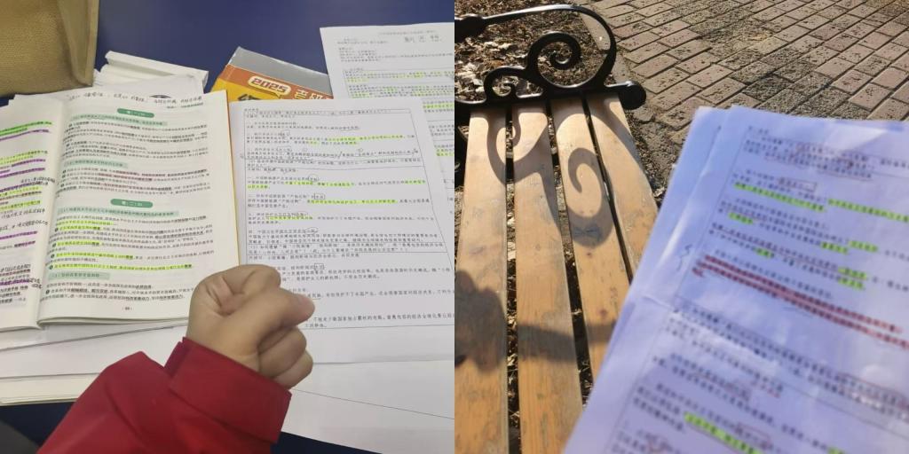 备考之时,她们同舟共济、并肩前行。每日晨光熹微,她们便已悄然起身,奔赴图书馆;夜幕低垂,图书馆闭馆后,校园花坛的静谧角落、楼道里的昏黄灯光下,仍可见她们刻苦攻读的身影。她们不畏炽热骄阳,不惧刺骨寒风,周而复始,从无怠慢。每一页写满字迹的纸张,每一本划满重点的教材,都是她们努力奋斗的见证。回到宿舍,交流学习心得、攻克学术难题、彼此鼓励打气,已然成为她们生活的日常。
