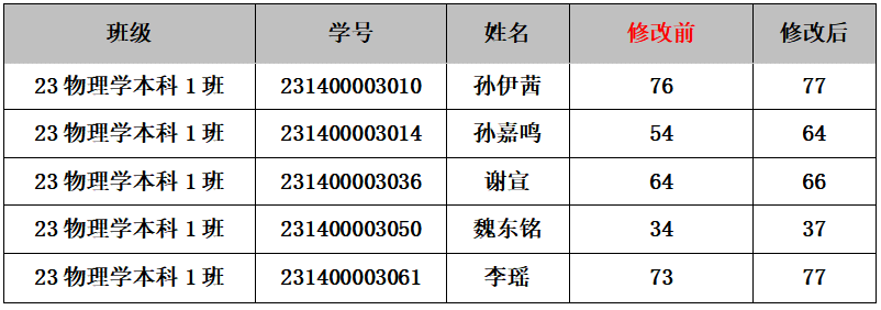 23物理学本科1班孙伊茜等5名同学的成绩经复核发现有错误,其中孙嘉鸣同学是因为合分时少算10分。需退回修改,特此说明。具体修改见下表。