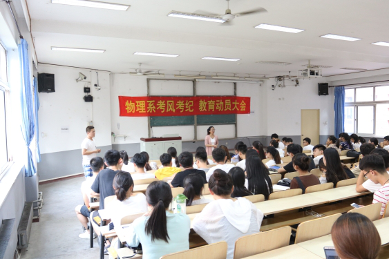 2018年6月26日,我系在第四阶梯教室召开了物理系考风考纪教育动员大会。到会的学校领导有:党总支副书记李雪梅老师,物理系辅导员老师冯会会老师;同学代表有:大一大二大三(除毕业班)的各班班干部,学生会成员,团总支成员,自管自律安防成员。